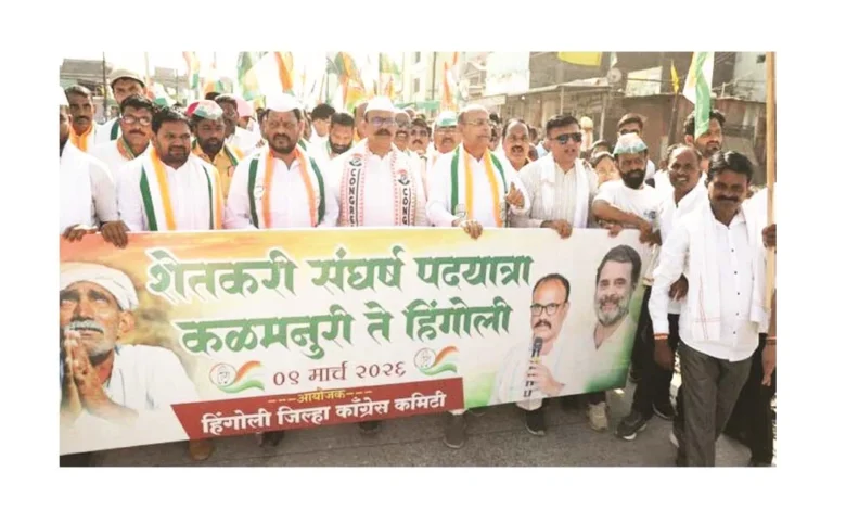 हिंगोली /9 मार्च – अमेरिकेबरोबर व्यापारी करार झाल्यापासून भारतातील सर्व शेतमालांचे भाव पडले आहेत, फळांचेही भाव पडल्याने शेतकर्‍यांचे मोठे नुकसान झाले आहे. शेतकर्‍यांच्या या नुकसानीला केंद्रातील नरेंद्र मोदी सरकारच जबाबदार असून नरेंद्र मोदी अमेरिकेसमोर सरेंडर झाले असून त्यांनी देश विकायला काढला आहे, अशी घणाघाती टीका करत मोदी सरकारच्या शेतकरी विरोधी धोरणाचा जाहीर निषेध करण्यासाठी, सरकारला जागे करण्यासाठी, तसेच शेतकरी, शेतमजूर, महिला, आदिवासी, मागासवर्गीय समाजाचा आक्रोश पोहचवण्यासाठी शेतकरी संघर्ष पदयात्रा काढण्यात आल्याचे, काँग्रेसचे प्रदेशाध्यक्ष हर्षवर्धन सपकाळ यांनी सांगितले. शेतकर्‍यांच्या प्रश्नांवर आज काँग्रेस प्रदेशाध्यक्ष हर्षवर्धन सपकाळ यांच्या नेतृत्त्वाखाली कमळनुरी ते हिंगोली शेतकरी संघर्ष पदयात्रा काढण्यात आली. सकाळी माजी खासदार स्व. राजीव सातव यांच्या स्मृतीस्थळाला अभिवादन करून पदयात्रेची सुरुवात करण्यात आली. यावेळी प्रसार माध्यमांशी बोलताना काँग्रेस प्रदेशाध्यक्ष हर्षवर्धन सपकाळ म्हणाले की, वर्धा ते गोवा शक्तीपीठ महामार्ग हा कोणाच्याही फायद्यासाठी नसून गडचिरोलीतील खनिज विदेशात पाठवण्यासाठी मध्य भारतातून समुद्रकिनार्‍यापर्यंत वाहतूक सुलभ करता यावी यासाठी हा महामार्ग केला जात आहे. हा महामार्ग पुंजीपतींसाठी टाकलेले रेड कार्पेट आहे.