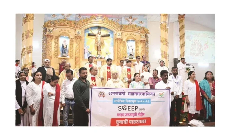 अमरावती /26 डिसेंबर : महानगरपालिका सार्वत्रिक निवडणूक 2025-26 च्या पार्श्वभूमीवर स्वीप (डतएएझ) उपक्रमांतर्गत आयुक्त तथा निवडणूक अधिकारी श्रीमती सौम्या शर्मा यांच्या मार्गदर्शनाखाली शहरात व्यापक मतदार जनजागृती अभियान राबविण्यात येत आहे. त्याच अनुषंगाने इर्वीन चौक परिसरातील सेंट कॅथेड्रल चर्चमध्ये आज ख्रिसमस दिन उत्साहात साजरा करण्यात आला.