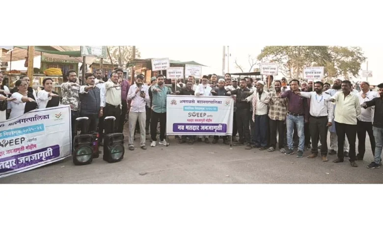 अमरावती /28 डिसेंबर : अमरावती महानगरपालिका सार्वत्रिक निवडणूक 2025-26 मध्ये मतदानाची टक्केवारी वाढावी, या उद्देशाने अमरावती महानगरपालिकेच्या वतीने नाविन्यपूर्ण उपक्रम राबविण्यात येत आहेत. मनपा आयुक्त माननीय सौम्या शर्मा चांडक यांच्या मार्गदर्शनाखाली स्वीप विभागामार्फत शहरातील विविध गर्दीच्या ठिकाणी जाऊन मतदार जनजागृती केली जात आहे.