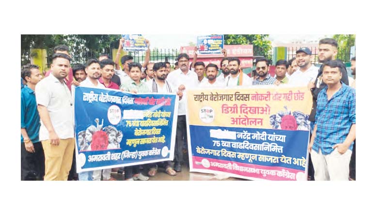 पंचवटी चौकात अमरावती युवक काँग्रेसच्या वतीने हे आंदोलन करण्यात आले. बेरोजगारीच्या प्रचंड प्रश्नावर केंद्र सरकार अपयशी ठरल्याचा आरोप करत युवक काँग्रेसने नरेंद्र मोदींच्या वाढदिवसाला ‘बेरोजगार दिन’ म्हणून साजरा करत तीव्र निषेध प्रकट केला. आंदोलनादरम्यान युवकांनी जोरदार घोषणाबाजी करत मोदी सरकारच्या धोरणांविरोधात संताप व्यक्त केला. केंद्र सरकारच्या रोजगारविषयक अपयशामुळे देशातील तरुण वर्ग निराशेत असल्याचे सांगून, केवळ घोषणाबाजीच्या आधारे रोजगार निर्मिती होत नसल्याचा हल्लाबोल करण्यात आला. राष्ट्रीय नेतृत्वाच्या सूचनेनुसार अमरावती युवक काँग्रेसने हे आंदोलन केले. या आंदोलनामुळे पंचवटी चौक स्थानिक पातळीवर निषेधाचे केंद्र ठरले. या निदर्शनात सहभागी सर्व युवकांनी बेरोजगारीच्या प्रश्नावर तातडीने उपाययोजना करण्याची मागणी सरकारसमोर केली.